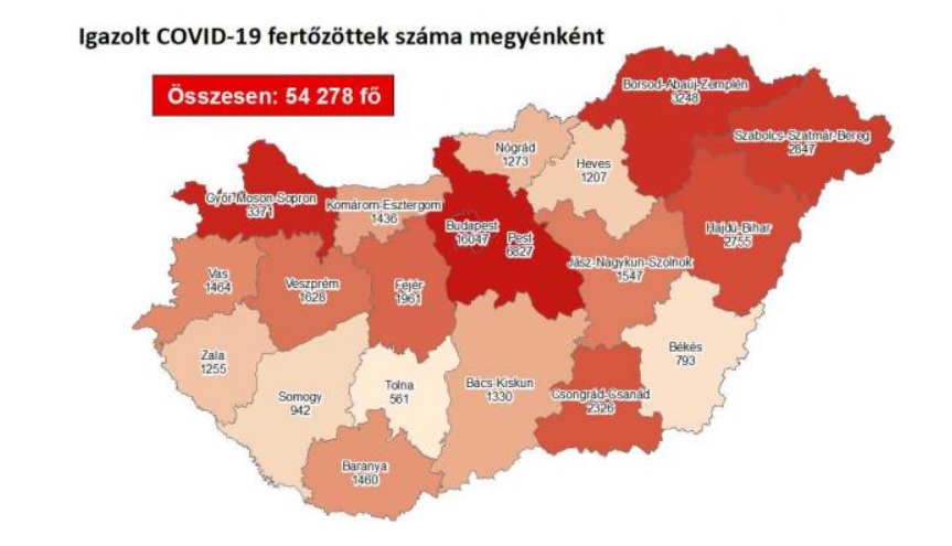 Az elmúlt 24 órában 2066 (rekord) újabb magyar állampolgárnál mutatták ki az új koronavírus-fertőzést ezzel 54 278 főre nőtt a hazánkban beazonosított fertőzöttek száma. A megyében 129 személyt regisztráltak, minek köszönhetően így már 2326 új esetet tartanak számon. Elhunyt 47 többségében idős, krónikus beteg, így az elhunytak száma 1352 főre emelkedett. 15 655-en azonban már meggyógyultak. 2209 koronavírusos beteget ápolnak kórházban, közülük 200-an vannak lélegeztetőgépen.