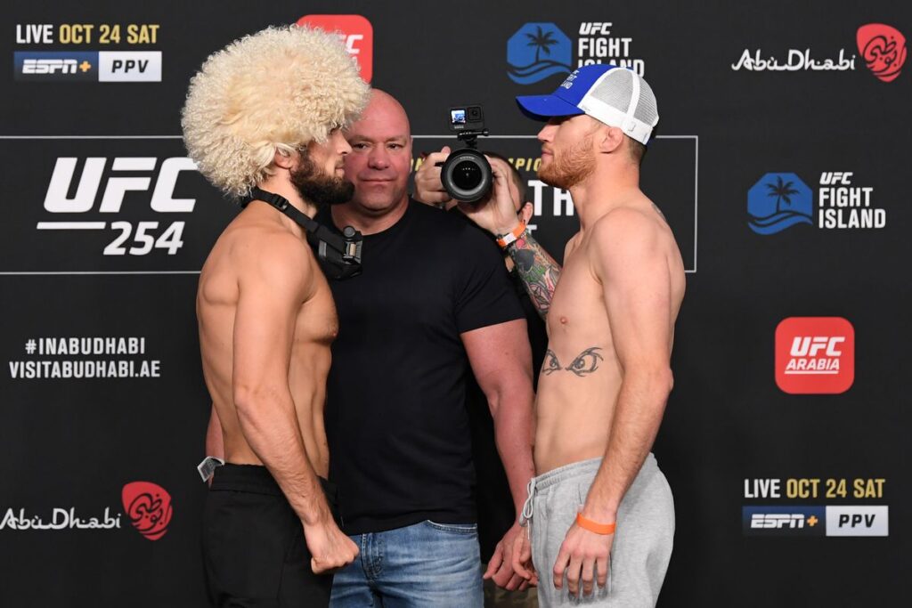 Több mint egy éve – 2019 szeptemberében – lépett legutóbb oktagonba a UFC-ben Khabib Nurmagomedov, akkor Dustin Poirier ellen nyert három menetben. Mostani ellenfele, a szintén amerikai Justin Gaethje éppen Khabib helyére ugrott be májusban a UFC 249 Tony Ferguson elleni főmérkőzésére, amelyen meglepetésre kiütéssel győzött. Ennek megfelelően Ferguson helyett ezúttal Gaethje léphetett a nyolcszög alakú küzdőtérre Abu-Dzabiban a mérkőzés előtt 28–0–0–s, hibátlan mérleget magáénak tudó orosz ellen.