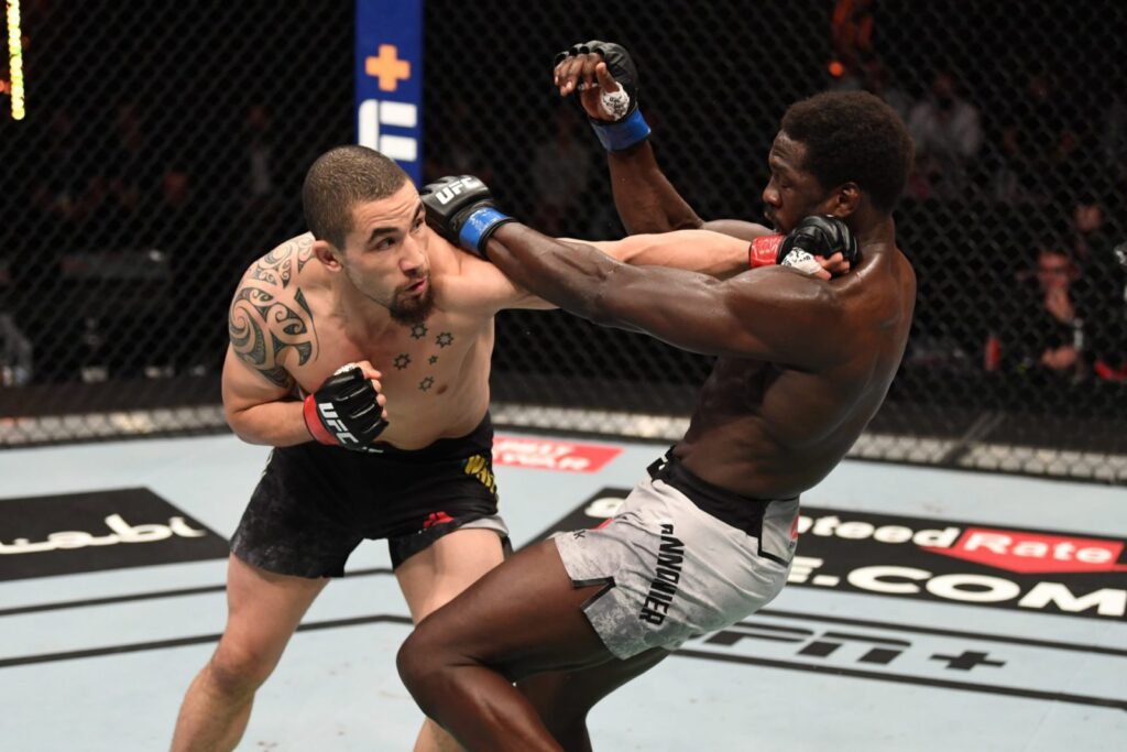 Robert Whittaker, a korábbi regnáló középsúlyú bajnok Jared Cannonier-rel csapott össze, a precíz állóharcot bemutató ausztrál folyamatosan uralta a küzdőtér közepét, non-stop szurkálva Cannonier-t. A meccs a Whittaker-től megszokott biztonsági játékot hozta, egészen a harmadik menetig, ahol elszabadult a pokol: Cannonier erősen megszédült egy ütéstől, arccal előre esett a padlóra. Whittaker egy kegyetlen ground and pound-dal ment rá, sőt, még egy hátsó fojtást is majdnem összehozott, de az amerikai túlélte az offenzívát.