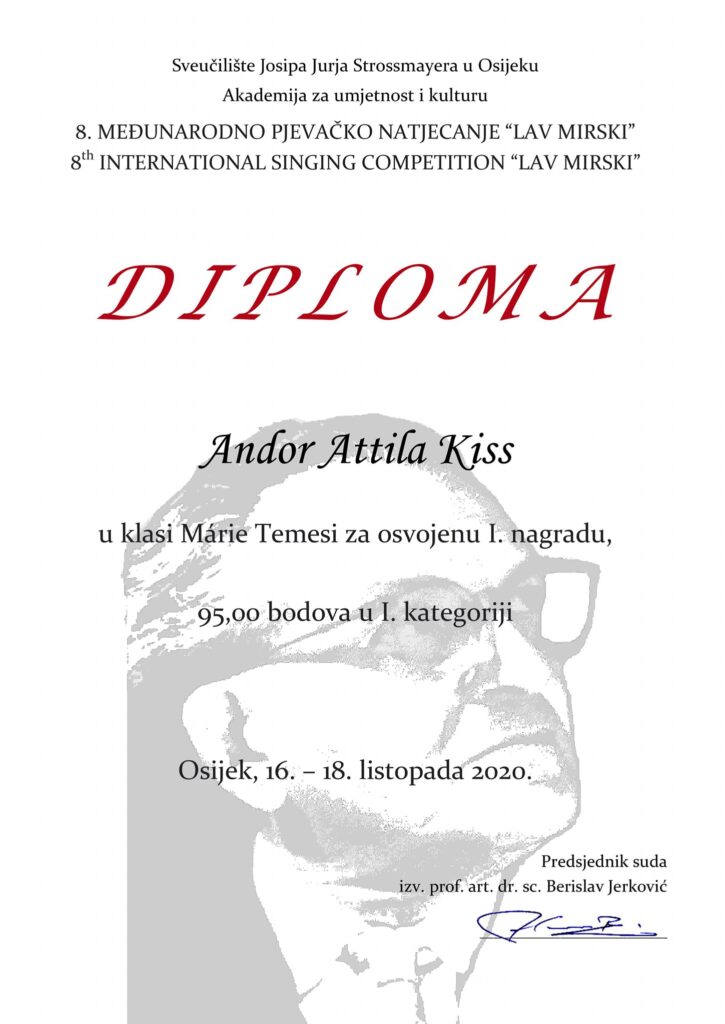 Kiss Attila Andor, a Szegedi Tudományegyetem Bartók Béla Művészeti karának másodéves egyetemi hallgatója a legfiatalabbak kategóriájában indult el és első díjat nyert a 8. Lav Mirski Nemzetközi Énekversenyen.