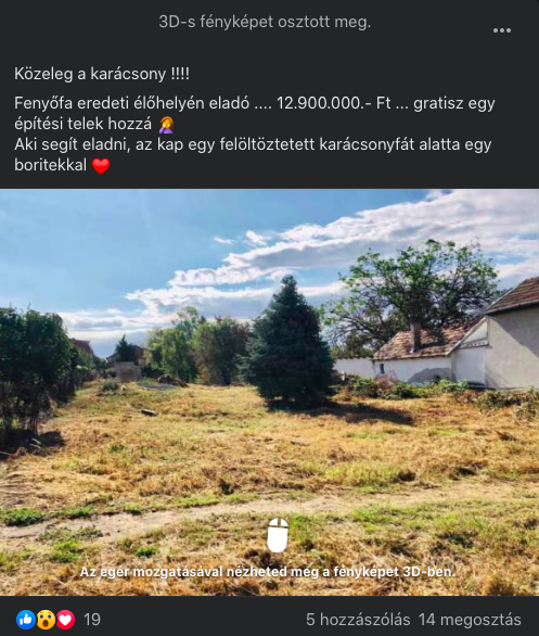 Na jó, egy grátisz építési telek is jár hozzá… Az év ingatlanhirdetését hozta össze egy szegedi hölgy, aki 12.900.000 ropogós magyar forintért hirdette meg a fotón látható – egyébként egészen impozáns – fenyőfát, melyhez ajándékba adná a fának otthont adó telket.