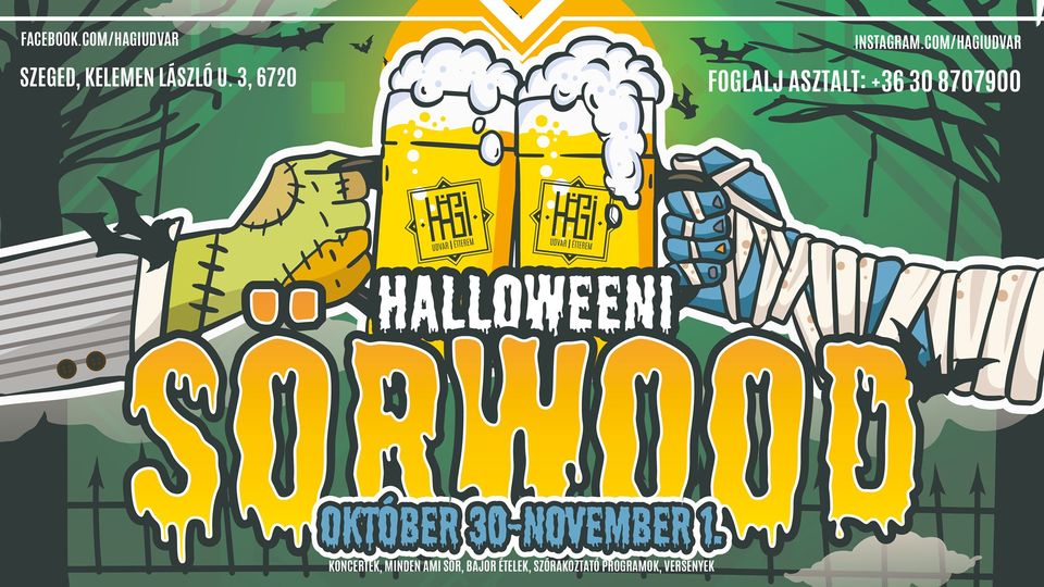 Már pénteken kezdetét vette a Halloweeni SörWood a Hági udvarban, ahol ma is lesznek sörök minden méretben és mennyiségben, zúzós ételek, hogy a bendőd biztosan telepakold, zenés programok és 18:00 órától sörrel kapcsolatos versenyek és családi játékok is! Szombaton 18:00-tól DJ Nacsa Bence érkezik, 19:00-kor pedig egy Slam Poetry előadással várnak, a sör pedig biztos, hogy egész este folyni fog!
