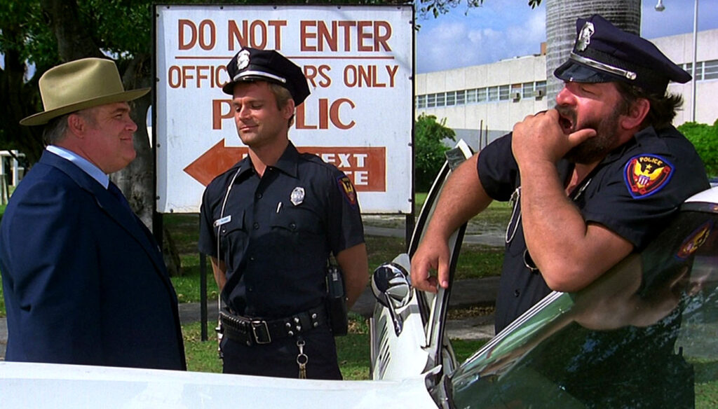 Ahogy kell, a Bűnvadászokban is felbukkannak a páros életét megnehezítő, kisstílű gengszterek, jön a jelenet, amikor Bud Spencernek rátaposnak a lábára, de nem fáj neki. Akad klasszikus erőpróba, ahol a megtermett színész legalább három embernél is erősebbnek bizonyul. Elengedhetetlen alkotóelem a komikus pofonosztás, a rettentő, kétkezes tenyeres és fentről a fejtetőre sújtott öklös, a Bud Spencert körbeálló, majd a pofonok hatására hirtelen szétrebbenő banda, Terence Hill pedig egyszerre komikus és változatos kreativitással ütlegeli az ellenfeleket. És mit sem érne az egész a rivalizálásból és érdekszövetségből kinövő barátság, szerethető habókos karakterek és retro házibulik elmaradhatatlan attrakciójának számító zene nélkül?