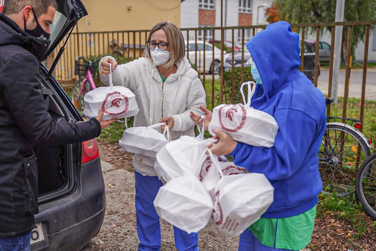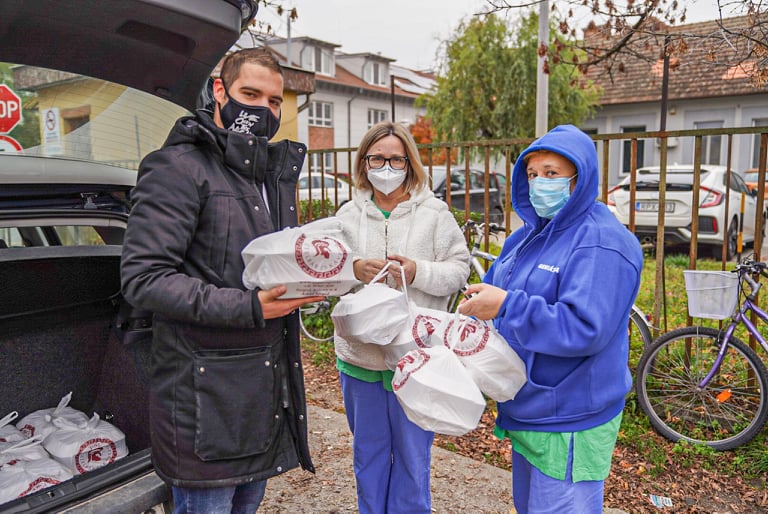 Kereken egy hete dobtuk fel, hogy mi lenne, ha re-bootolnánk a tavasszal elkezdett Szegedi Hősök akciónkat, melynek célja, hogy Veletek közösen erőt adjunk azoknak, akik értünk küzdenek a járványhelyzet legnehezebb heteiben. A képlet egyszerű: Ti elkülditek, hová menjünk, mi pedig – karöltve egy focicsapatnyi remek szegedi vállalkozással – eljuttatjuk a meglepetéseket a hétköznapok hőseinek. Ismét fantasztikusak voltatok: eddig már közel 900 (!!) e-mail és üzenet futott be hozzánk, egytől – egyig remek ajánlásokkal. Egyértelmű volt, hogy az SZTE Szent-Györgyi Albert Klinikai Központ II-es kórházában kell kezdenünk, a beérkezett üzenetek közül legalább 70-80 szólt arról, hogy a Kálvária sugárúton igazi hősök küzdenek, ráadásul rengeteg a koronavírus-beteg az épületben. Az akcióhoz keresve sem találhattunk volna tökéletesebb partnert a Kölcsey utcai Trója Ételbárnál, akik 30 adag laktató, egészséges ebéddel lepték meg az ott dolgozókat.