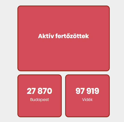 Az aktív fertőzöttek száma 125 789 fő. Az aktív fertőzöttek 22%-a, az elhunytak 26 %-a, a gyógyultak 27%-a budapesti.