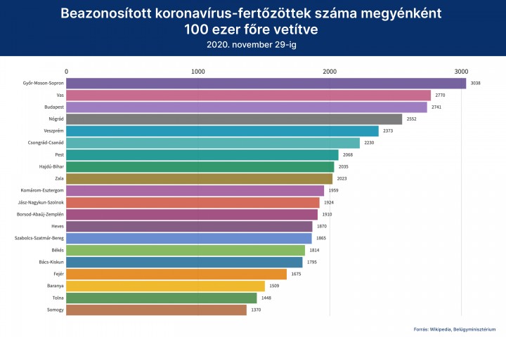 Mint írják, lakosságarányosan vizsgálva sokáig Budapesten regisztrálták a legtöbb koronavírusos esetet, november 9-én jött fel az első helyre Győr-Moson-Sopron megye, 1761 fertőzöttel. 20 nappal később ez a szám már 3000 fölötti. A második helyen ma Vas megye váltotta Budapestet, 2770 illetve 2741 esettel. Vas megyében szeptember elsején 4, október elsején 208, míg november elsején már 921 fertőzöttet regisztráltak, ez a szám azóta megháromszorozódott. Csongrád-Csanád megye a hatodik, nálunk 100 ezer főre 2230 regisztrált fertőzött jut, rögtön bennünket követ Pest megye, 2068 eddigi esettel.