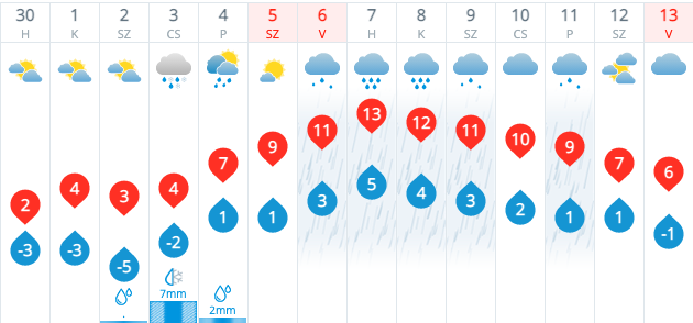 Hétfőn eleinte sok felhő lesz felettünk és helyenként hószállingózás, hózáporok alakulhatnak ki, délután több napsütés ígérkezik – írja prognózisában az Időkép. Gyenge, mérsékelt marad a szél. A fagyos reggelt követően -1 és +6 fok között alakul a hőmérséklet a délutáni órákban.