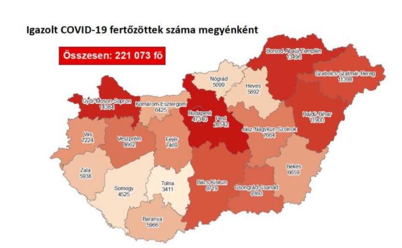 Regisztrált fertőzöttek száma, országosan: 221 073 (változás +3951) fő