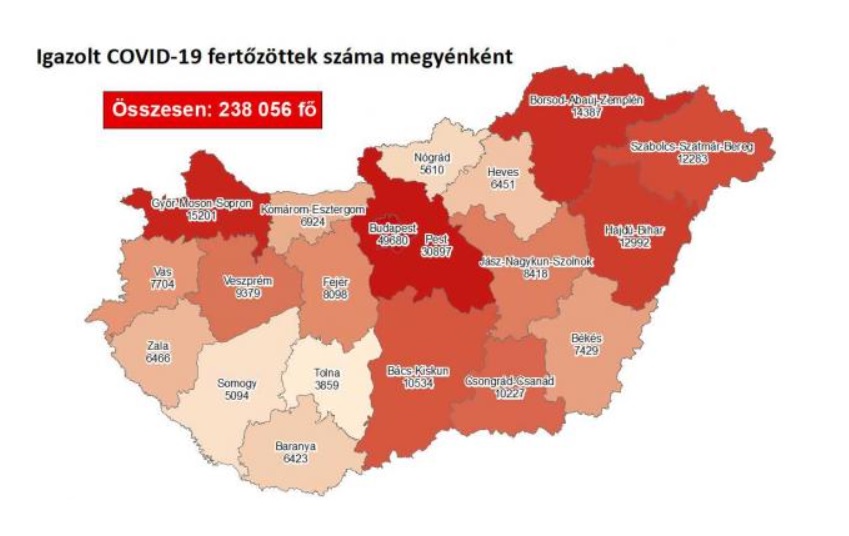 Regisztrált fertőzöttek száma, országosan: 238 056 (változás +6212) fő