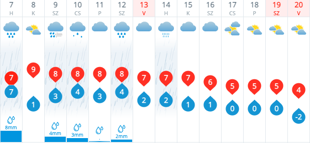 A tavaszias Mikulás-hétvégét követően hétfőn esős, borongós időt kapunk az égiektől. A csapadékzóna kelet felé halad, magyarán mondva vasárnap este a Dunántúl nyugati részén fog esni, Szegedre és környékére pedig a legnagyobb valószínűséggel hétfő délutánra fut be az angol időjárás. A délkeleti szél többfelé élénk, főként kezdetben erős lehet. Napközben 4 és 11 fok közé melegszik a levegő.