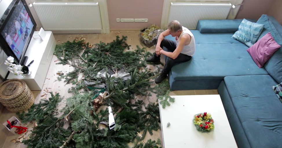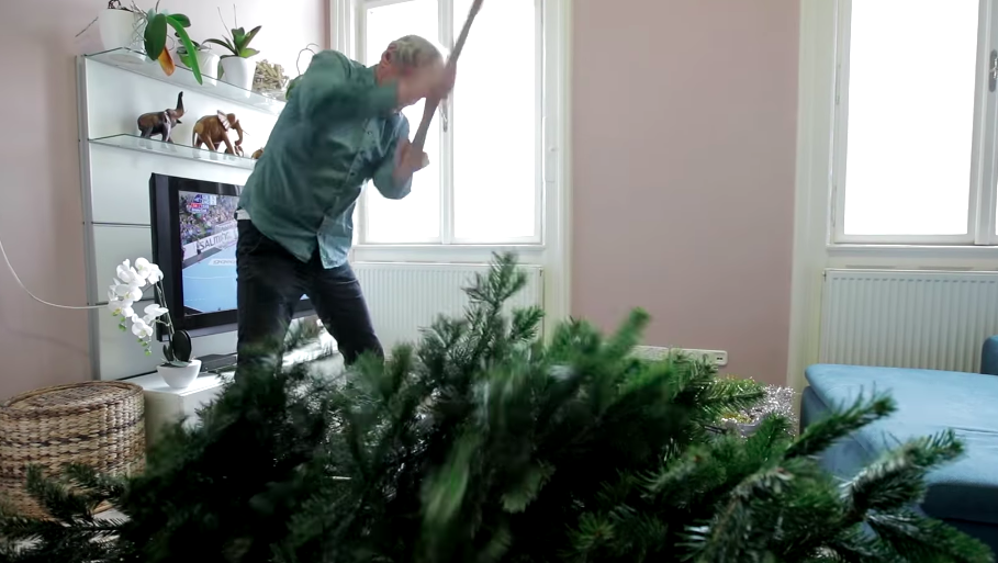 (2.) Ha már idegállapotba került, káromkodik egy sort és jól szétborít valamit – jelen esetben speciel a fent említett fenyőfát a szintén fent említett fejszével: