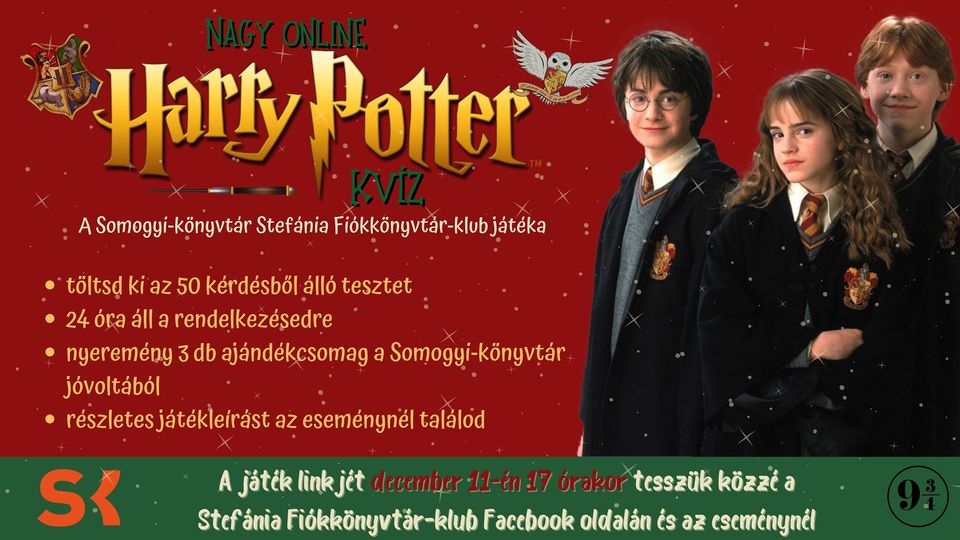 Mindent tudsz Harry Potter világáról? Akkor a 17:00-kor induló nagy online HP kvíz neked való! A kvíz 50 kérdésből áll, minden kérdéshez 4 válaszlehetőség tartozik, és csak egy a helyes. Minden kérdés megválaszolására 30 másodperc gondolkodási idő áll a rendelkezésedre. A pontozásnál a válasz helyessége mellett a kérdésre adott válasz gyorsasága is számít.