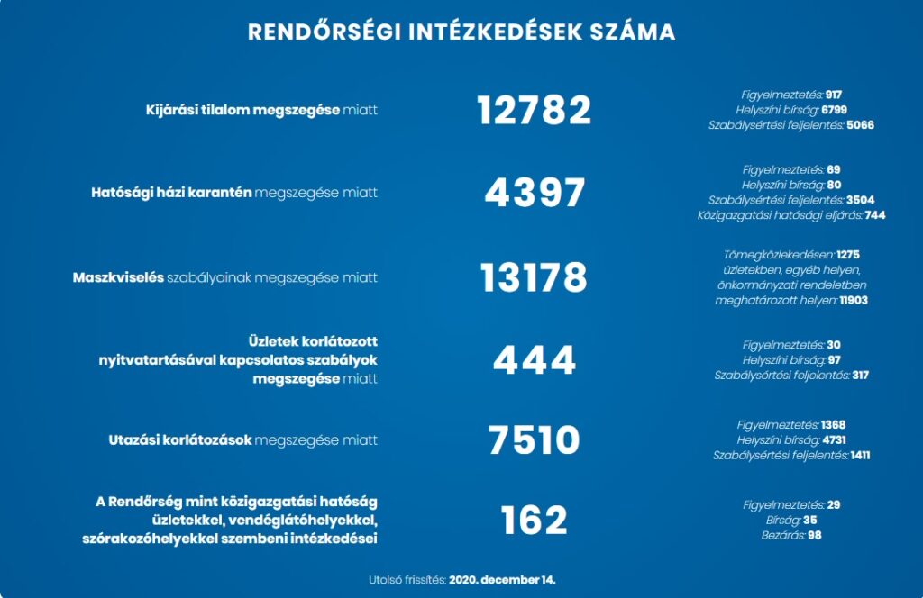 Az alezredes arról is beszámolt, hogy vasárnap egy csemegeüzlet raktárában többen nem viseltek maszkot, ezért helyszíni bírságot szabtak ki, valamint öt napra bezáratták a boltot. Részletezte, hogy a hétvégén 1083 esetben kellett intézkedni a kijárási tilalom megszegése miatt, az összes eddigi eset 12 782. A tranzitszabályokról az alezredes ismertette: 250 rendőri intézkedés történt, 67 787 esetben pedig hatósági házi karantént ellenőriztek, 17 789 újabb karantént rendeltek el, és összesen 43 966 zárlat van hatályban jelenleg.