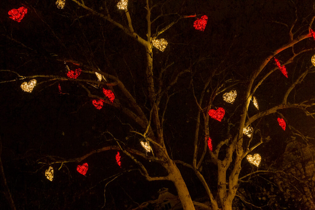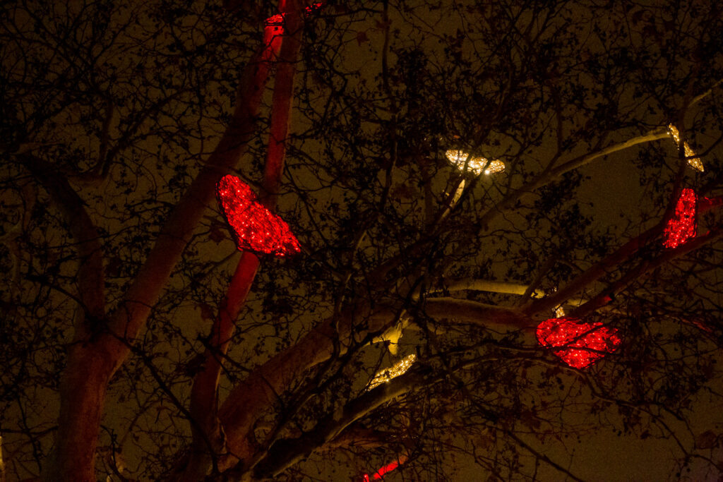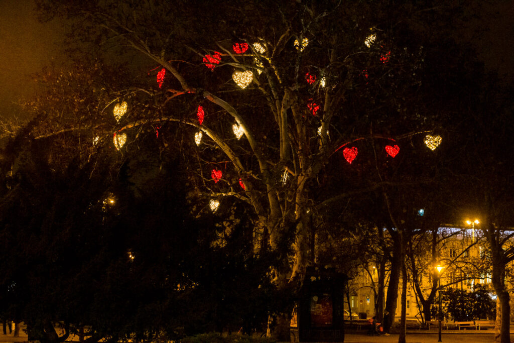 Az Anna kút mellett az ünepi időszakra szivecskékbe burkolózott a Széchenyi tér egyik platánfája is. A körülötte folyó, egész napos nyüzsgés-mozgás mellett, valahogy olyan megnyugtató látványt nyújt, amelyet az ember akár órákig is képes lenne elnézegetni.
