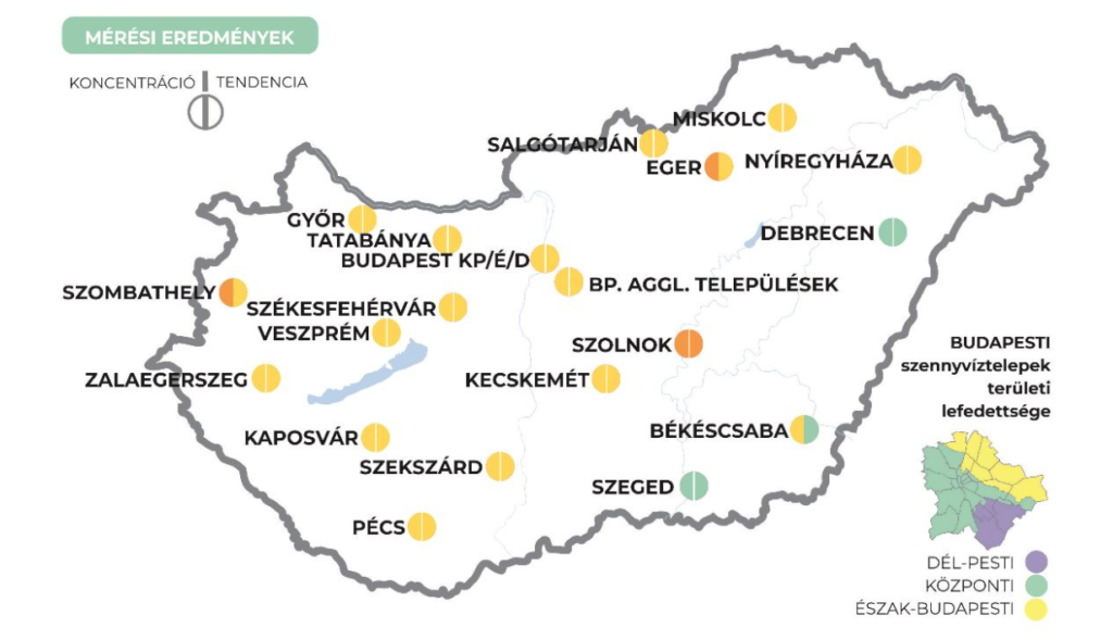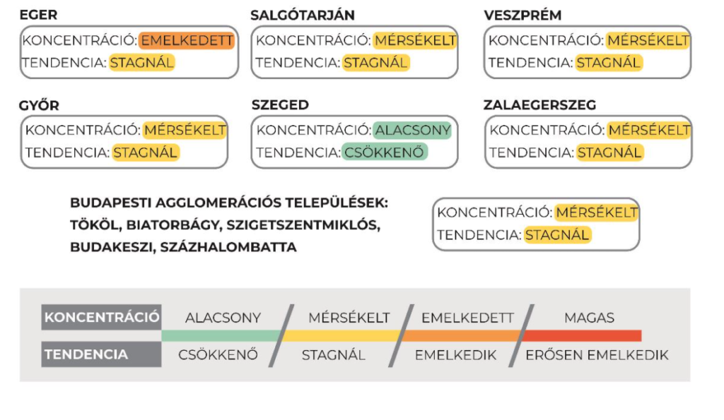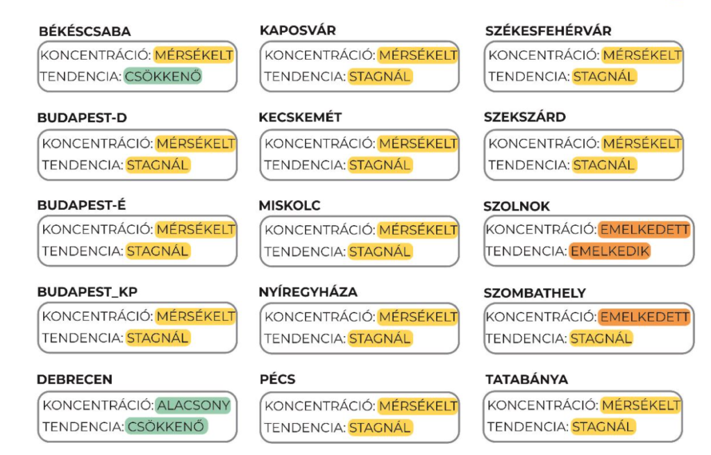 A vizsgálatok alapján az átlagosnál magasabb a koncentráció Eger, Szolnok és Szombathely esetében. Debrecen és Szeged mellett egyébként tovább csökkent Békéscsabán is a koncentráció.