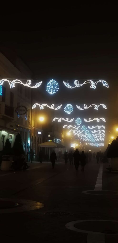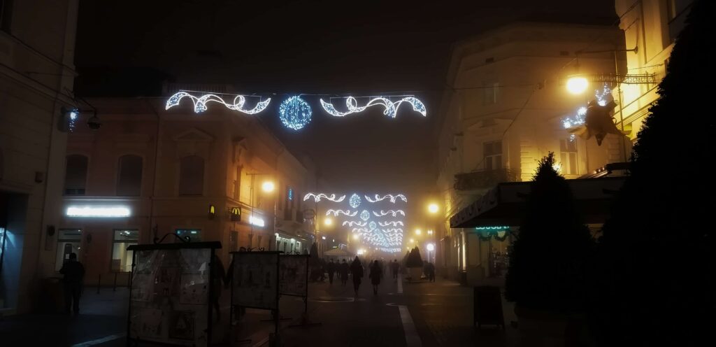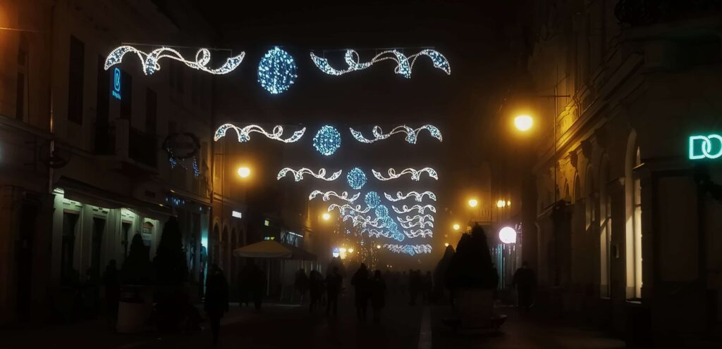 Még lenyűgözőbbé teszi a ködbe burkolózott sétáló tömeg és a felettük csillogó folyóként hömpölygő ünnepi díszkivilágítás, amely igazi ékessége Karácsony közeledtével a Kárász utcának.