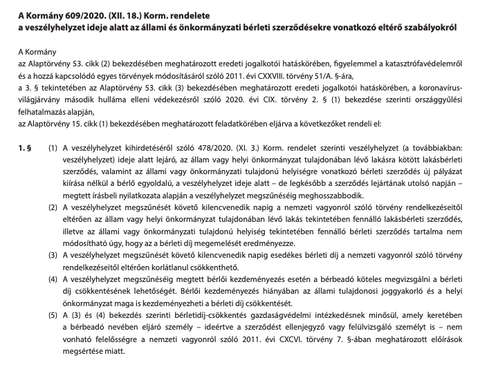 “A veszélyhelyzet kihirdetéséről szóló 478/2020. (XI. 3.) Korm. rendelet szerinti veszélyhelyzet (a továbbiakban: veszélyhelyzet) ideje alatt lejáró, az állam vagy helyi önkormányzat tulajdonában lévő lakásra kötött lakásbérleti szerződés, valamint az állami vagy önkormányzati tulajdonú helyiségre vonatkozó bérleti szerződés új pályázat kiírása nélkül a bérlő egyoldalú, a veszélyhelyzet ideje alatt – de legkésőbb a szerződés lejártának utolsó napján – megtett írásbeli nyilatkozata alapján a veszélyhelyzet megszűnéséig meghosszabbodik.”