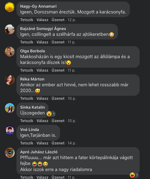 “K…ra földrengés van, ki érzi?” – írta ki Facebook oldalára a Csongrádon élő, a Covid-mentes időkben a szegedi éjszakában pörgő Big Bill, az újszegedi Zotya azt írta a hozzánk elküldött üzenetében, hogy “megindult a fa”, a Hódmezővásárhelyen élő Kriszti szerint pedig úgy megindult a csillár, mintha a Paranormal Activity című filmben lett volna. Az egyik olvasónk a Budapesti úton tartózkodott a munkahelyén, amikor érezték a dolgot, mint írta, olyan volt, mintha szédülne, megmozdulna vele minden, az eset nagyjából 10 másodpercig tartott. Nem hivatalos információink szerint Szegeden, a megyeházáról többen kirohantak a rezgés hatására. Hasonló volt a helyzet más városokban is, Pécsett az Időkép.hu beszámolója alapján úgy megijedtek, hogy kiürítettek egy áruházat.