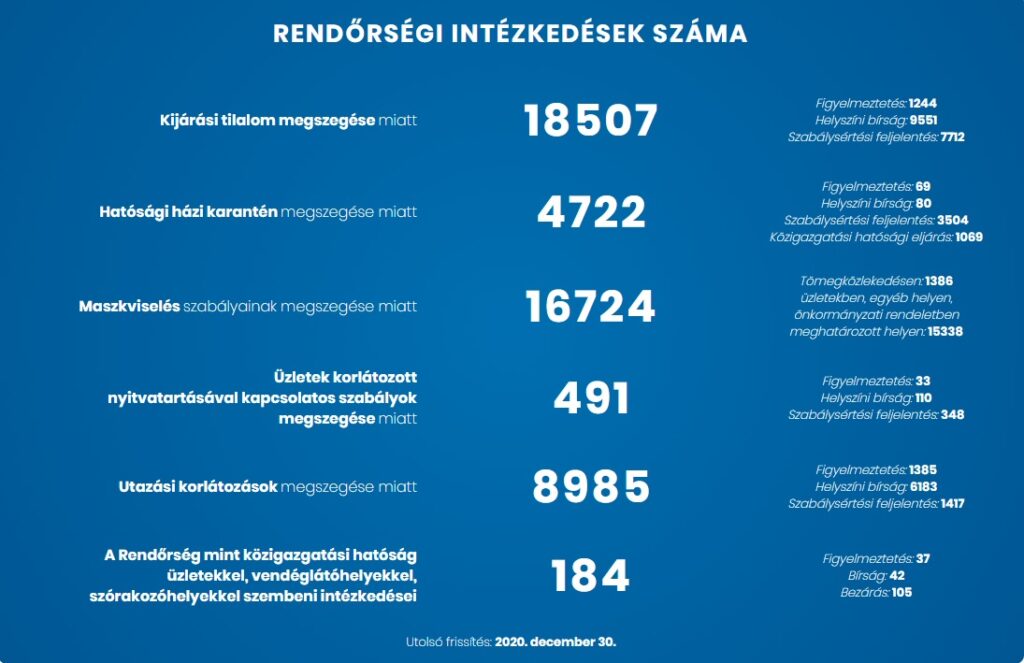 Tájékoztatása szerint 198-an az önkormányzati rendeletek ellenére sem viselték a maszkot közterületen; közülük 41-en helyszíni bírságot kaptak, 65 emberrel szemben pedig szabálysértési feljelentést tettek, a többieket figyelmeztették. Ugyanakkor 12 emberrel szemben azért intézkedtek, mert buszon, villamoson, megállóban nem volt rajtuk maszk, 17-en pedig bevásárlóközpontban nem viselték a védőeszközt – tette hozzá az alezredes.