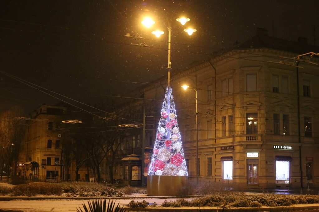 …a villanypóznára tekeredett art-deco karácsonyfa, a Dugonics téri kettős körforgalom lófara felőli részén: