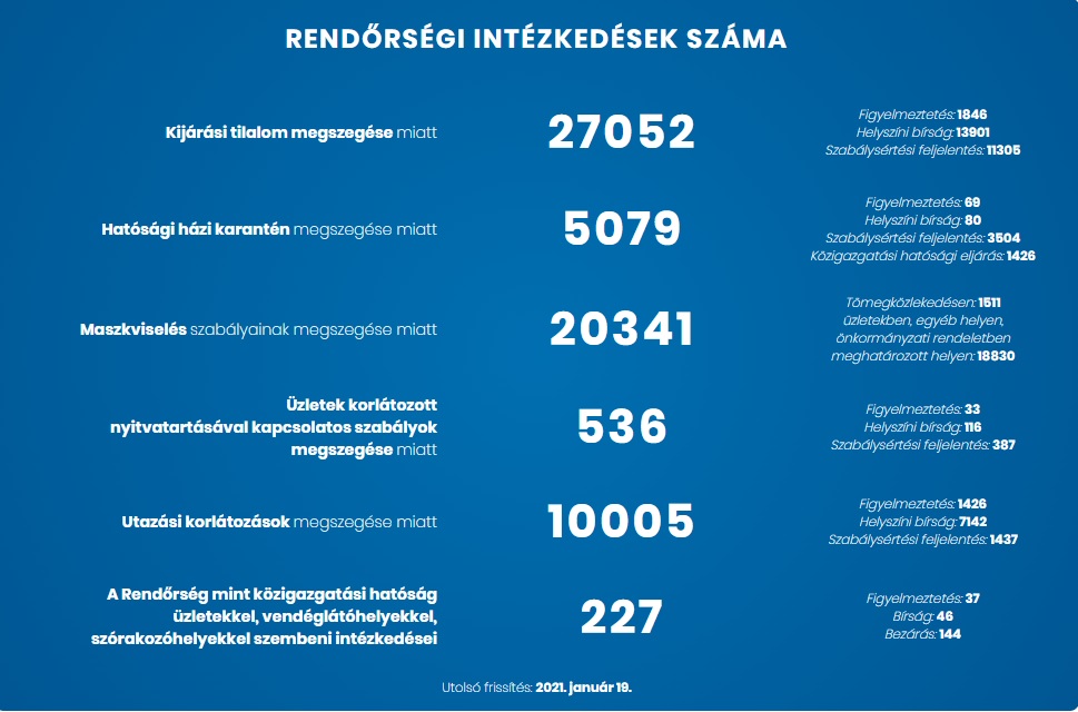 Mint elmondta, a védelmi intézkedésekről szóló kormányrendelet szeptember 21-ei hatályba lépése óta 20 ezer 341 emberrel szemben intézkedtek maszkviselési kötelezettség figyelmen kívül hagyása miatt. Tájékoztatása szerint a rendőrök 121 emberrel szemben azért léptek fel, mert tízezer lakosnál nagyobb települések közterületén megszegték a maszkviselésre vonatkozó önkormányzati rendeletet. Tömegközlekedési eszközökön, azok várakozóhelyein 10, üzletekben, bevásárlóközpontokban 19 emberrel szemben intézkedtek a rendőrök a maszkviselési kötelezettség figyelmen kívül hagyása miatt hétfőn – mondta.