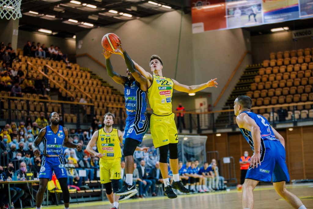 Tippmix férfi kosárlabda NB I./A csoport, 20. forduló. Pécs, Lauber Dezső sportcsarnok, zárt kapuk mögött. Vezette: Cziffra, Török R., Fodor.