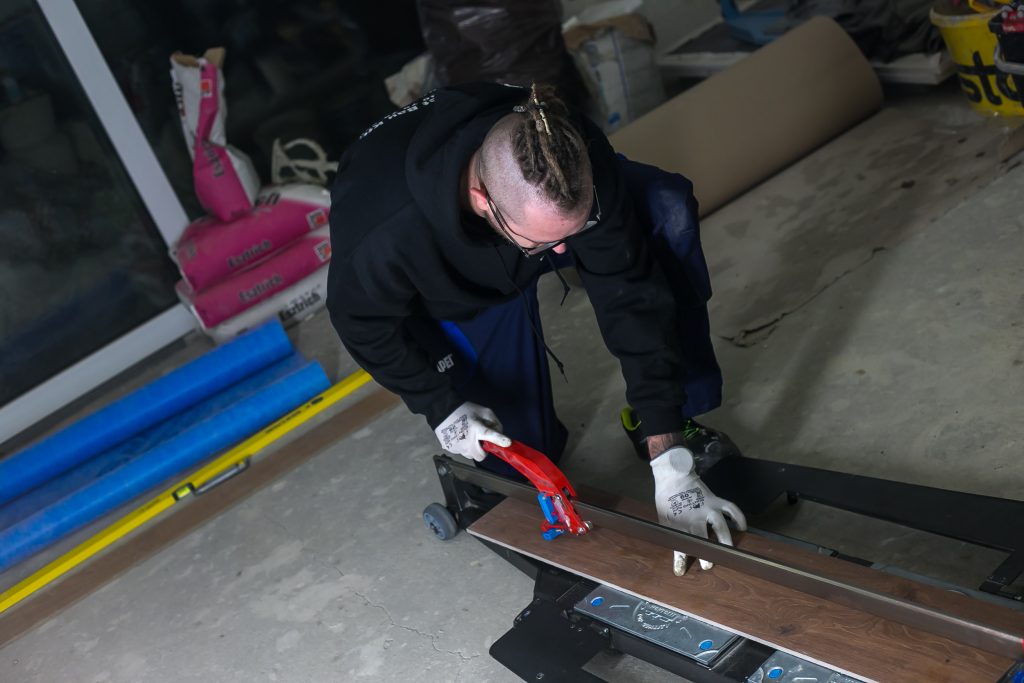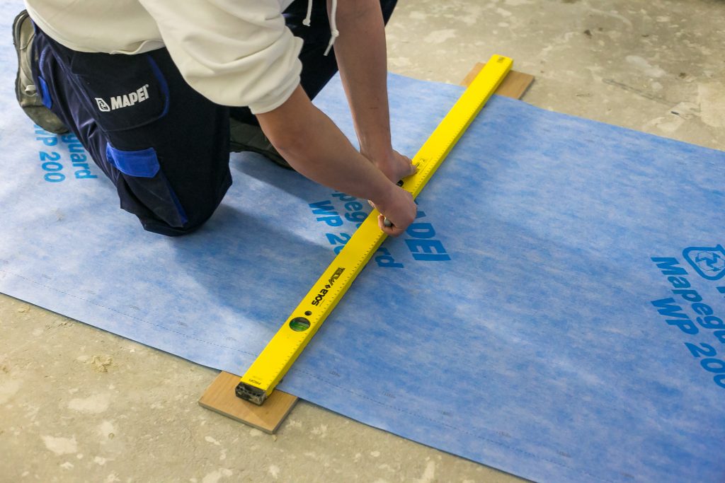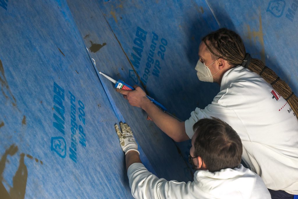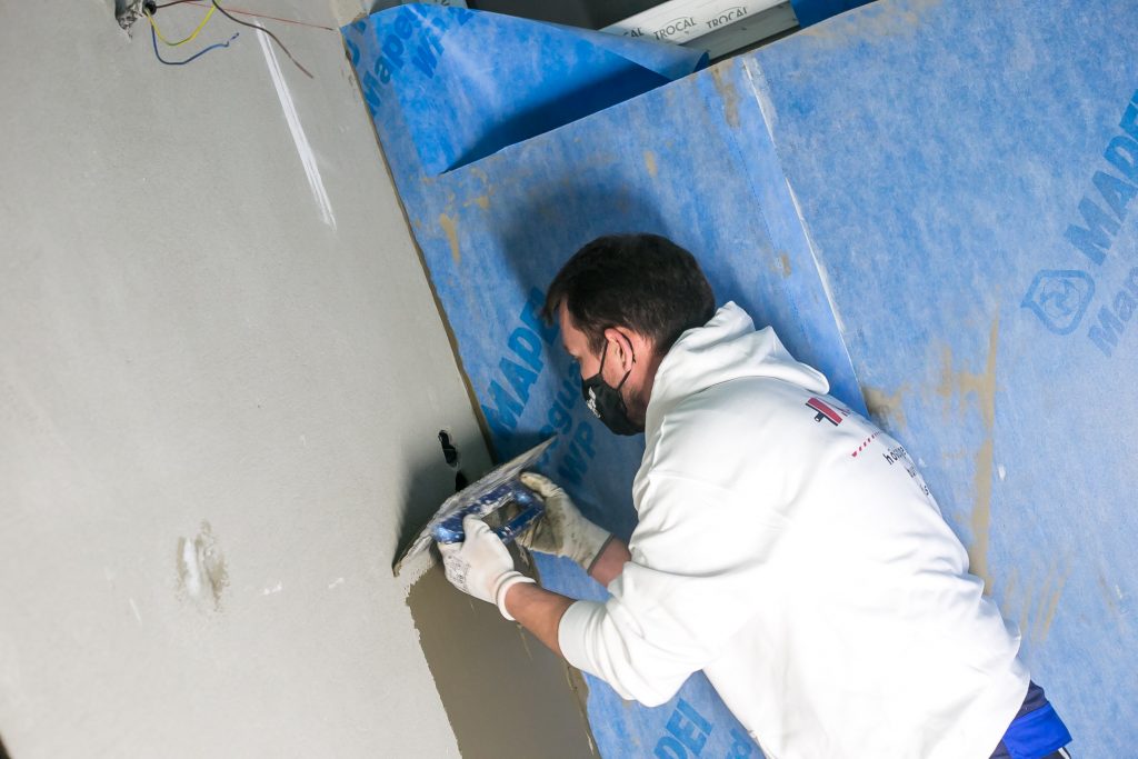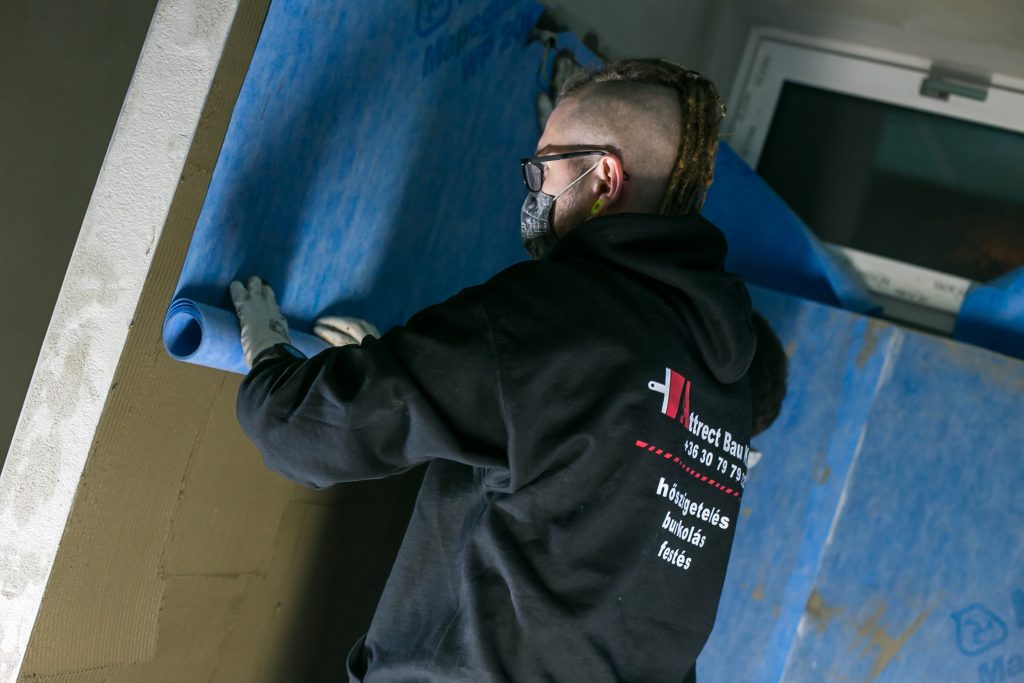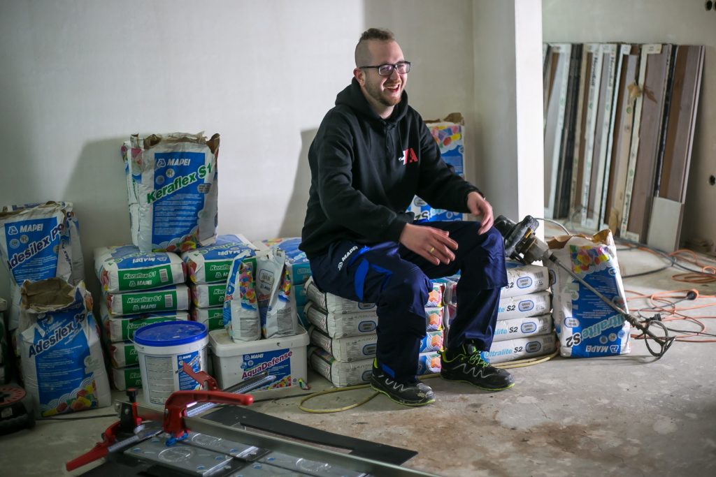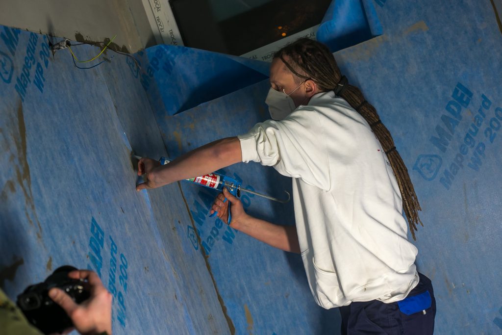A srácokat egy szegedi ház fürdőszobájának burkolására kísértük el. Először a megfelelő csemperagasztó került a falra, ezt követte a lúgálló vízszigetelés és törésgátló membrán felhelyezése, és ha már minden elem a helyére került, akkor a burkolati elemek méretre vágása és elhelyezése történt meg.