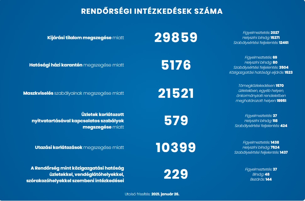 Közölte: 127 emberrel szemben azért volt szükség rendőri fellépésre, mert tízezer lakosúnál nagyobb településeken megszegte a maszkviselésre vonatkozó önkormányzati rendeletet. Közülük 40 embert figyelmeztettek, 36-an kaptak helyszíni bírságot, 51-et feljelentettek. Szabálytalan maszkviselés miatt tömegközlekedési eszközökön és várakozóhelyein hét, üzletekben, bevásárlóközpontok területén 19 ember ellen intézkedtek hétfőn. Az alezredes hozzátette: a védelmi intézkedésekről szóló kormányrendelet szeptember 21-ei hatályba lépése óta 21 521-szer intézkedtek maszkviselési szabályok megszegése miatt.
