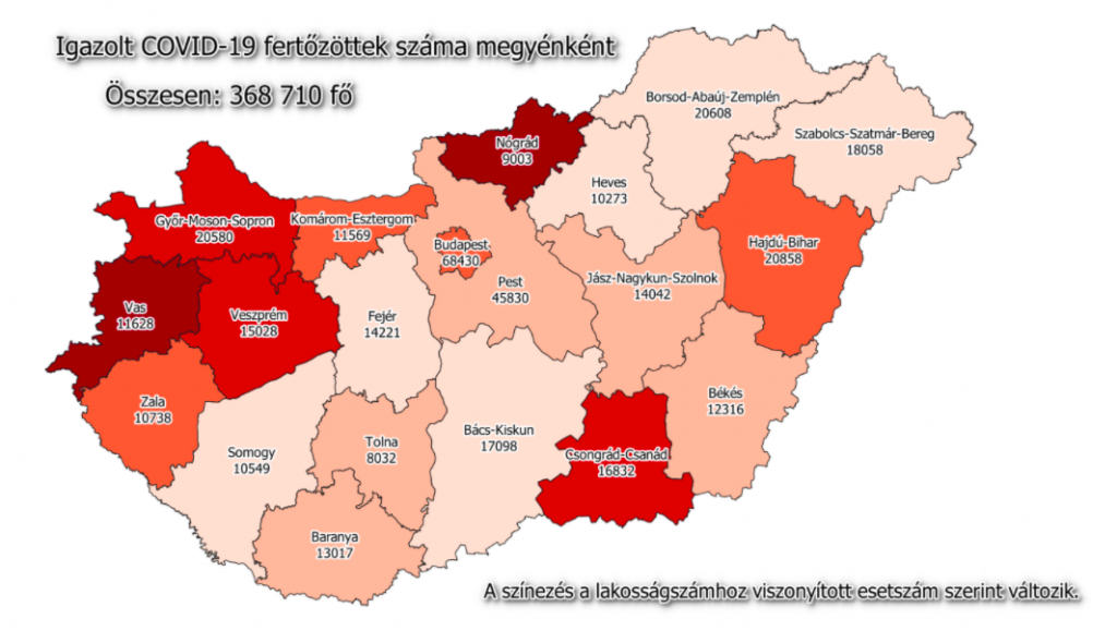 1124 újabb magyar állampolgárnál mutatták ki az új koronavírus-fertőzést (COVID-19), ezzel 368 710 főre nőtt a hazánkban beazonosított fertőzöttek száma. A megyében 48 esetet regisztráltak az elmúlt 24 órában. Elhunyt 54 többségében idős, krónikus beteg, így az elhunytak száma 12 578 főre emelkedett. A gyógyultak száma is folyamatosan nő, jelenleg 264 260 fő, az aktív fertőzötteké 91 872 főre csökkent. 3682 koronavírusos beteget ápolnak kórházban, közülük 273-an vannak lélegeztetőgépen.