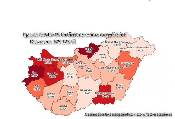 1561 újabb magyar állampolgárnál mutatták ki az új koronavírus-fertőzést (COVID-19), ezzel 375 125 főre nőtt a hazánkban beazonosított fertőzöttek száma. A megyében 46 esetet regisztráltak az elmúlt 24 órában. Elhunyt 96 többségében idős, krónikus beteg, így az elhunytak száma 13 026 főre emelkedett. A gyógyultak száma is folyamatosan nő, jelenleg 277 949 fő, az aktív fertőzötteké 84 150 főre csökkent. 3601 koronavírusos beteget ápolnak kórházban, közülük 298-an vannak lélegeztetőgépen.