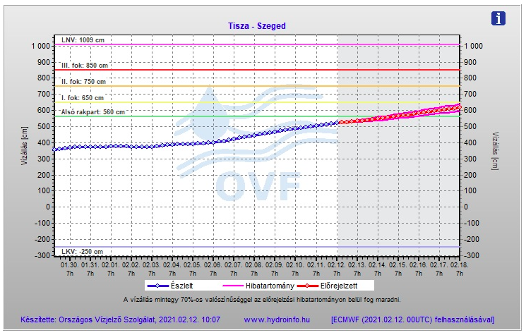 - a rakpart szintje: 560 cm. Makrai László tájékoztatása szerint ez az a pont, ahol a járda alatt futó átvezető csatornákon elkezd az úttestre szivárogni a Tisza vize, első körben tócsákat létrehozva az aszfalton. Ez utóbbiak – tekintettel a zord időjárásra – megfagyva elég balesetveszélyesek lehetnének, ha nem zárnának mielőbb.