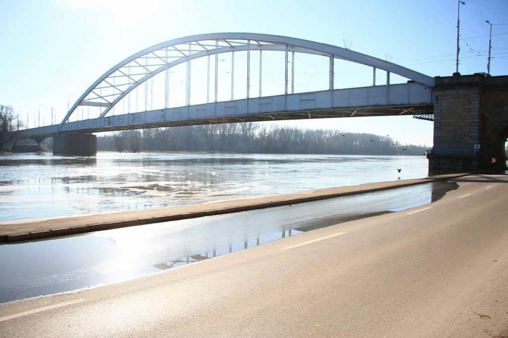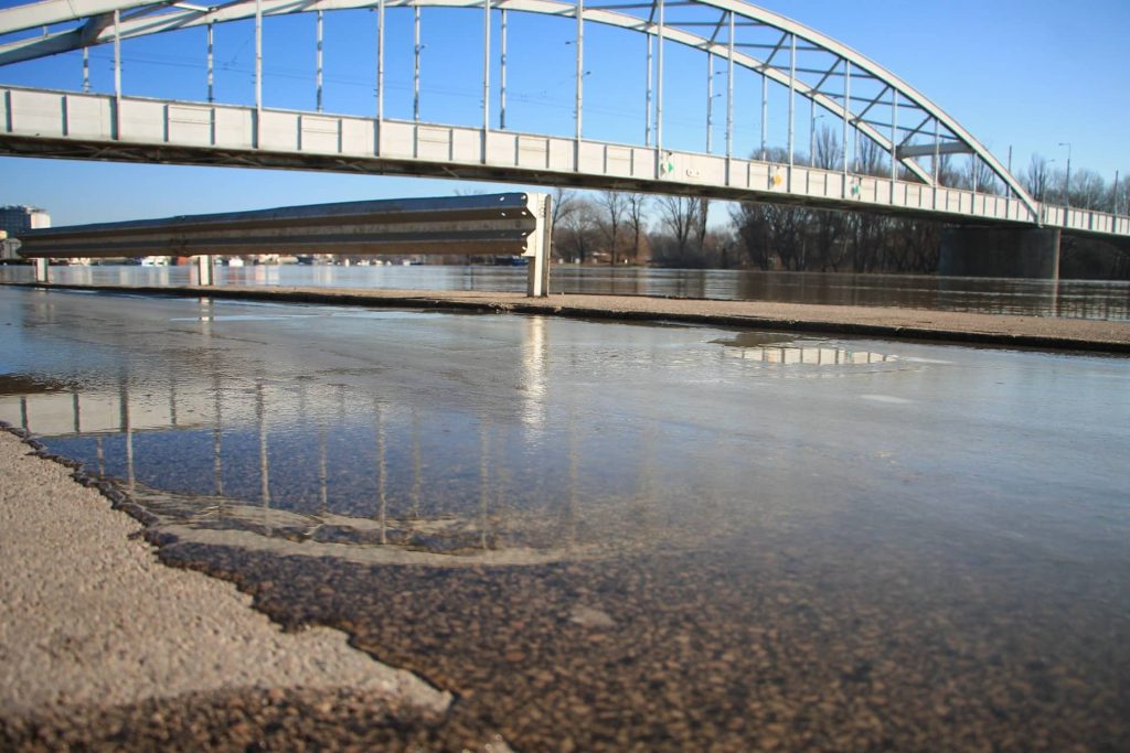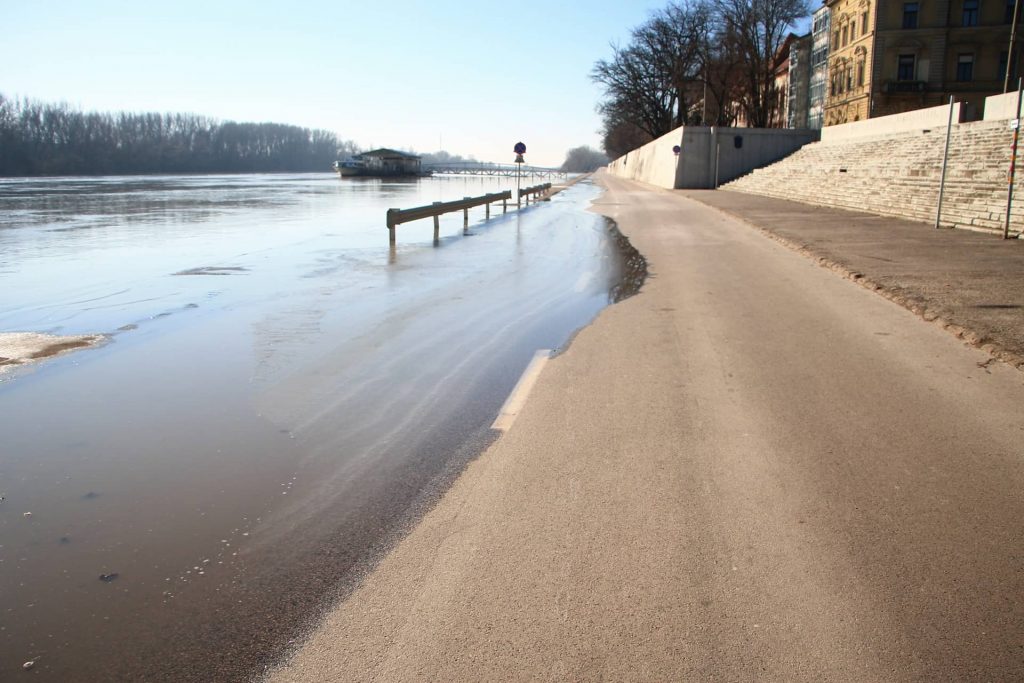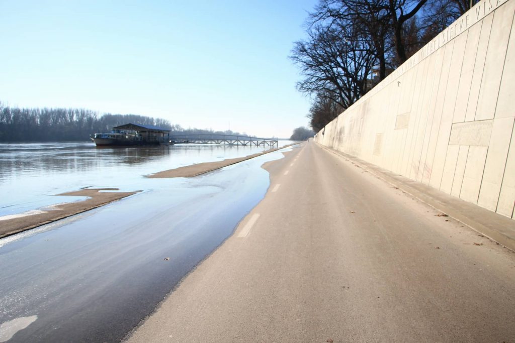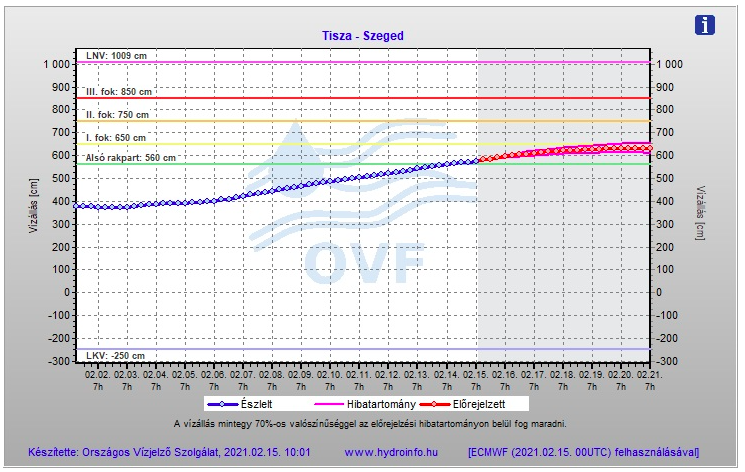 560 cm. A szint, amikor a folyó a rakpart Tisza felőli járdája alatti áteresztő csatornákon már elkezd átszivárogni az úttestre, apró tócsákat kialakítva. Ez még nem az árvízvédelmi készültségi szint, az utóbbi 650 cm-nél jön Szegeden (egyes szint), viszont itt már érdemes lezárni a Huszár Mátyás rakpartot, mert a beömlő vízmennyiség balesetveszélyes lehet, pláne a mostani cudar időben, lefagyva.