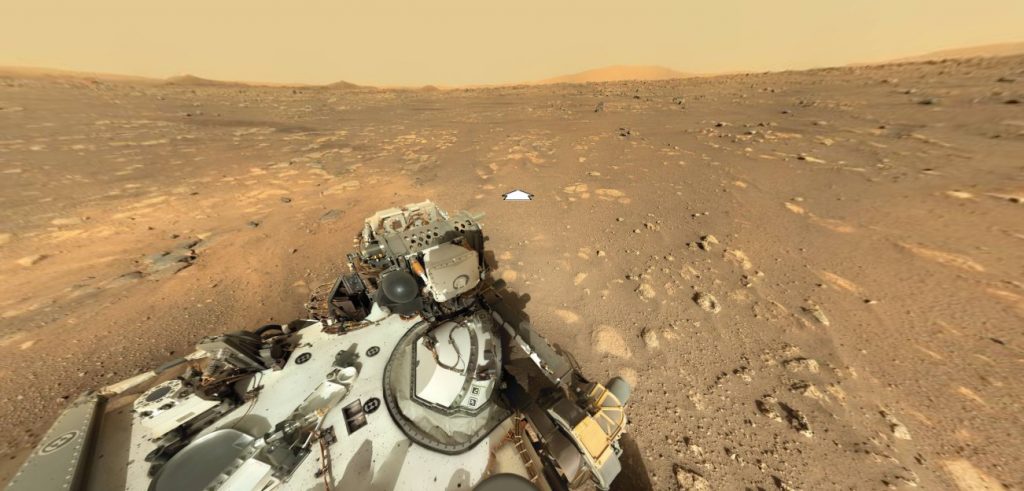A képen egy kietlen régió látható, rajta geológiai formációkkal, köztük egy szélkoptatta sziklával és a marsjáró landolási helyszínének, a Jezero-kráternek a peremével. Ám most készült egy 360 fokos körpanoráma videó, a bolygóról származó hanggal (8K):