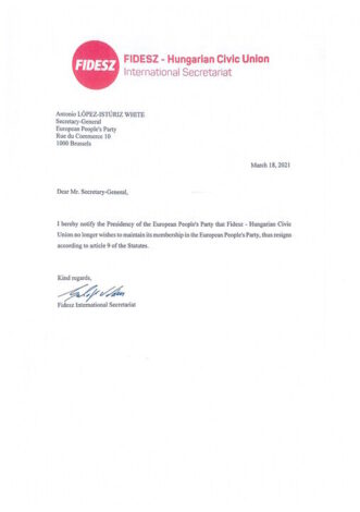 Itt az idő elbúcsúzni – közölte Twitter-bejegyzésében Novák Katalin, mellékelve a Fidesz Európai Néppártból való kilépési nyilatkozatát. A néppárti frakcióból való kilépésről még március 3-án döntött a Fidesz, miután az Európai Néppárt frakciója megszavazta azt az alapszabály-módosítást, amely szerint nem csak tagokat, hanem egész delegációkat lehet kizárni és felfüggeszteni a néppárti képviselőcsoportból. A 187 néppárti EP-képviselő közül a módosítás mellett 148-an szavaztak, 28-an voltak ellene, négyen tartózkodtak. A Fidesz korábban jelezte, hogy az egész módosítást ellenük intézett támadásként értékelik, s hogy annak elfogadása esetén önként távoznak a frakcióból.