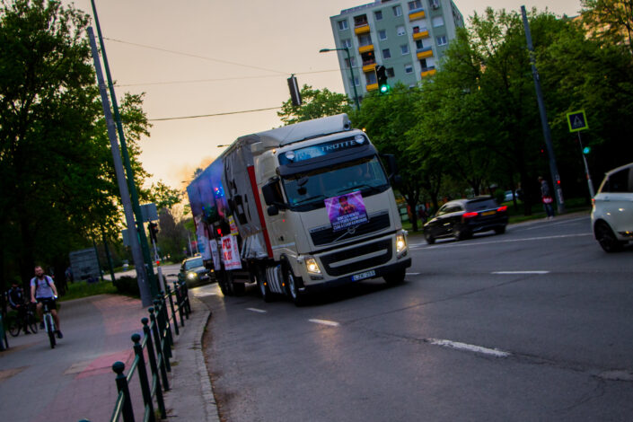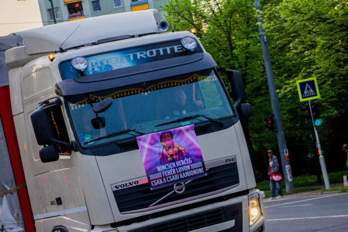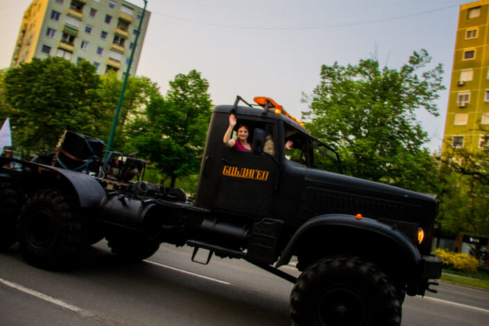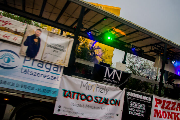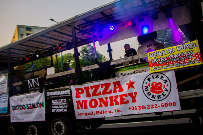 A 13 méter hosszú platón a 80-as, 90-es évek szegedi éjszakáinak party-himnuszait pörgették délután 1-től egészen este fél 10-ig, Török Kornél fotós kollégánk pedig lencsevégre kapta a Szeged utcáit körbejáró partykamiont: