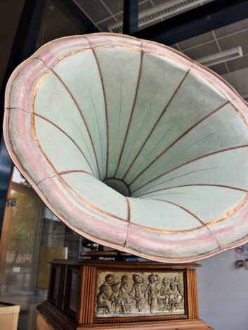 A 20. század elején készült gramofon – ezen eszköz forradalmasította a zenetörténetet, ugyanis a széles tömegeknek tette lehetővé a zenehallgatást ‑ egy felajánlás révén került a tavalyi évben a Tornyai János Múzeum Néprajzi Gyűjteményébe. A gépi zenelejátszás korai szakaszából származó gramofon az 1900-as évek első évtizedében értékes és modern tárgyként kerülhetett egy vásárhelyi polgárcsalád otthonába. A feltehetően bécsi gyártmányú tárgy díszítményei közt a leghangsúlyosabb a petúnia virágra emlékeztető színes hangtölcsér, valamint a furnérozott test frontját ékesítő domborított ónlemez, amely mulatozó puttókat ábrázol.