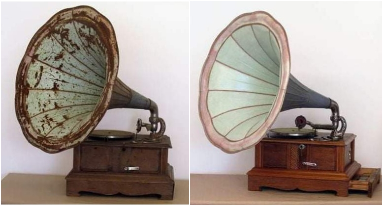 A lemezjátszó rozsdás hangtölcsérrel, elvetemedett ládával, azonban összes tartozékával érkezett a vásárhelyi múzeumba. A tulajdonosok hosszú évtizedeken át használhatták nagy-nagy tisztelettel és odafigyeléssel a gramofont, amelyről a restaurálás során feltárt kiegészítések és javítások nyomai tanúskodtak. Molnárné Balázs Zsuzsa vezetésével megtörtént a virágformájú tölcsér és az óndomborítások korróziómentesítése, valamint a furnérlemezek kiegészítése. A műtárgy aprólékos restaurálás eredményeként nemcsak egykori fényét nyerte vissza, de újra működőképessé is vált. A kirakat-kiállítás e különleges darabja május végéig megcsodálható a Rapcsák András úton, a múzeum ablakán át – védettségi igazolvány nélkül is.
