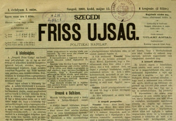• 1900. május 15-én indult a Szegedi Friss Ujság, s közel fél századig, 1944-ig volt jelen a helyi sajtópiacon.