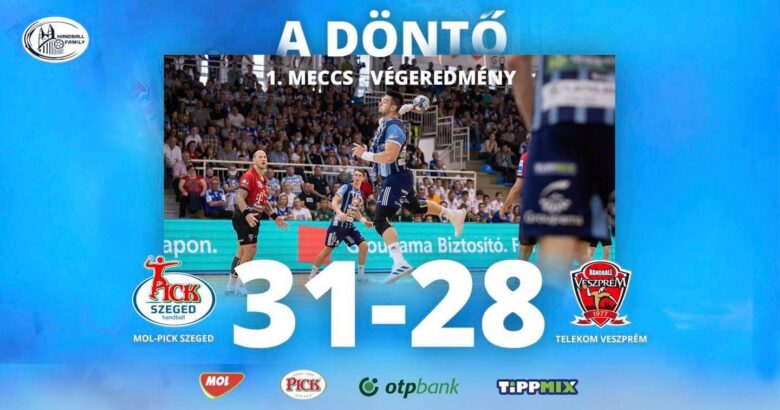 31-28-as győzelmet aratott a MOL-PICK Szeged az örök rivális Telekom Veszprém ellen a férfi kézilabda NB I. bajnoki döntőjének első mérkőzésén, Szegeden, az újszegedi sportcsarnokban – mindezt 3000 néző szeme láttára, olyan hangulatban, hogy majd’ kigyulladt az épület. A Kékek egy nagyon szoros, 14:14-es első félidő után, parádés Mikler-védésekkel és brutális Bánhidi gólokkal tarkítva szerezték meg a győzelmet. A végeredmény 31-28, viszlát Veszprémben, szombaton!