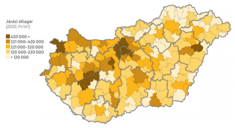 Döntően a Balaton-parti településeken tapasztalható jelentős áremelkedés hatására, 2020-ban a megyék árlistáján első helyre ugrott Somogy, elsőként átlépve a 400 ezer Ft/m2-es határt (444 ezer Ft/m2). Győr-Moson-Sopron, Pest és Hajdú-Bihar tízezer forinton belül vannak a 400 ezres szint alatt. A legolcsóbb hagyományosan Nógrád megye, 118 ezer Ft/m2 átlagértékkel. Csongrád-Csanád megye a kilencedik helyen van, éppen átlépve a 300 ezer Ft/m2 átlagot.