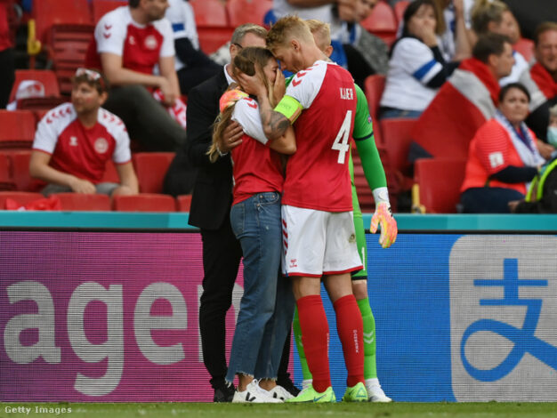 Eriksen barátnője a helyszínen szurkolt a dán csapatnak, időközben ő is a pályára futott, akit a csapatkapitány Simon Kjaer mellett Kasper Schmeichel ölelt folyamatosan és próbált erőt adni neki.