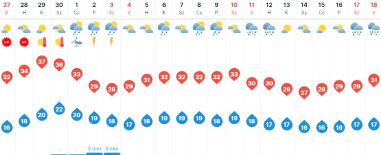 Sok napsütésre számíthatunk, egy-egy zápor, esetleg zivatar csak néhol északkeleten fordulhat elő, tehát Szegeden sem kell csapadékra számítani. A légmozgás hétfőn többnyire gyenge, vagy mérsékelt lesz, viszont kedden már ismét berobbant a kánikula. Ekkor már 37 fok körüli hőmérsékletre számíthatunk Szegeden.
