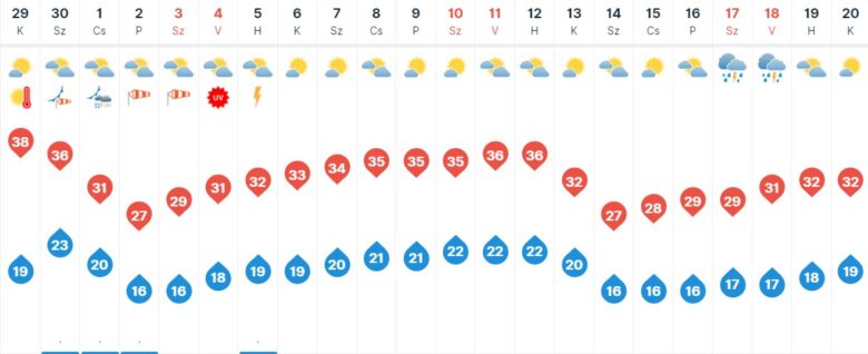 Hajnalban 23-25 fokot mérhetünk, majd napközben már 29-38 fokos maximumokra van kilátás Szegeden. Az érkező hidegfront csütörtökön érezteti majd leginkább hatását, visszaesik a hőmérséklet, de még így is 31 fok lesz Szegeden.
