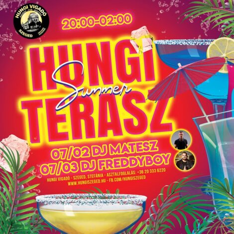 Pénteken ismét lesz Hungi Summer Terasz Szegeden, ezúttal Szoboszlai Mátéval, majd szombaton Földes Péter rázza fel a szegedi éjszakát. A Tisza DOKK is készül, pénteken jön a Helló lányok! a lemezjátszók mögött pedig Welldan és Walsh lesznek, majd ismét Sexy lesz a szombat Gabriel B-vel a fedélzeten, Walsh-al pedig a teraszon.