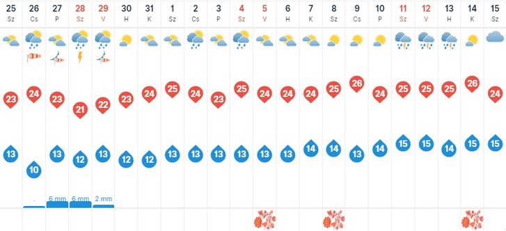 • Csütörtök délután újabb hidegfront érkezik esővel, záporokkal. Erős lesz a nyugati szél; 21–27 fokos maximumokra számíthatunk.