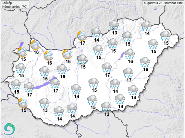 Az ország délkeleti felén, kétharmadán felhő- és csapadékzóna vonul, nagyobb mennyiség délkelet felé haladva valószínű. Az éjszaka második felétől fokozatosan felszakadozik, csökken a felhőzet, egyre inkább a Tiszántúlra korlátozódik a csapadék. A szél északnyugatira, északira fordul, hajnaltól a Dunántúlon megélénkül, másutt többnyire mérsékelt marad. A késő esti 12, 16 fokról hajnalra 8 és 14 fok közé hűl le a levegő.
