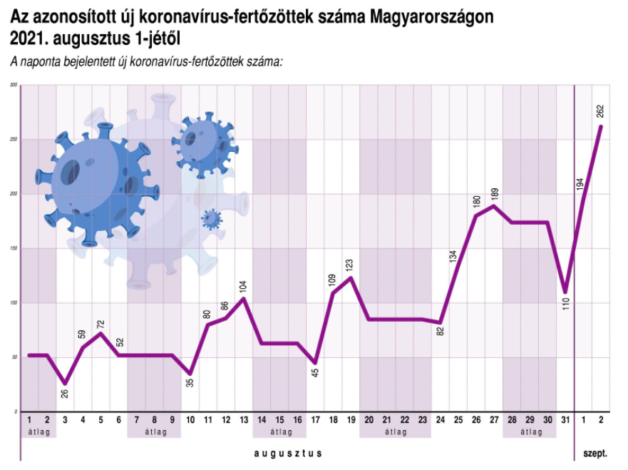 Nem vagyunk matematikusok, de egy valami biztos: napról napra emelkedik a 24 óra alatt azonosított fertőzöttek száma. Míg szeptember 1-jén a szóban forgó adat 194 volt, ma reggelre 262 új esetet regisztráltak. A Nemzeti Népegészségügyi Központ adatai szerint egy halálos áldozatot követelt a Covid-19 ma reggelre.