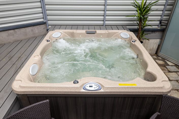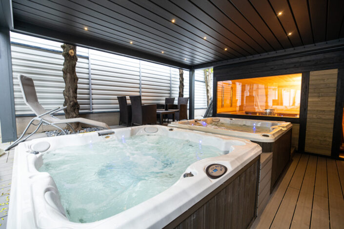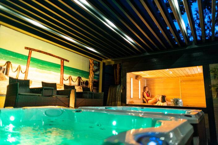 A szobákhoz, khm a kabinok egy részéhez még terasz és jacuzzi is tartozik, sőt, van egy közös spa-részleg is, tikfából épített szaunával és további jacuzzikkal. Ilyen: