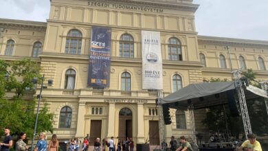 Csütörtök délután 15 órától az SZTE a centenáriumi tanév rendezvénysorozatának programjaként egy nem mindennapi flashmobra hívták a Szegedi Tudományegyetem polgárait. Az eseményen résztvevő diákok és oktatók egymást “440 Kolozsvár – 100 Szeged” feliratú szalagokkal összekötve ölelték körbe az SZTE Dugonics téri központi épületét, az egyetem bejárata előtt egyébként Fendler Judit kancellár állt. A flashmob-ot a … Bővebben: Szeged365 Live: Szent-Györgyi Albert születésnapján ölelték át a Szegedi Tudományegyetemet
