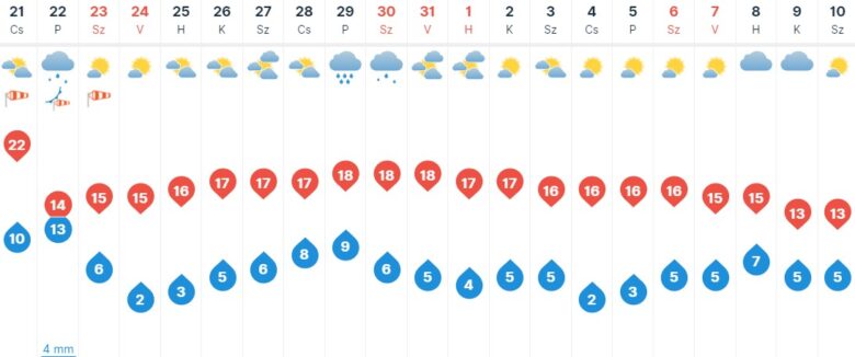 Érdemes lehet kihasználni a szerdai jó időt, hiszen csütörtökön már megerősödik, többfelé viharossá fokozódik a délnyugati szél. A napos időszakok mellett a délután második felétől, és főként estétől már több helyen kialakulhat eső, zápor. A csúcshőmérséklet 18-24 fok között alakul ezen a napon és csak szólunk: ez lesz az utolsó nyárias nap a szezonban, hiszen pénteken már betör a hidegfront és véget vet az indián nyárnak Szegeden. Csütörtöktől így fog kinézni az időjárásunk: